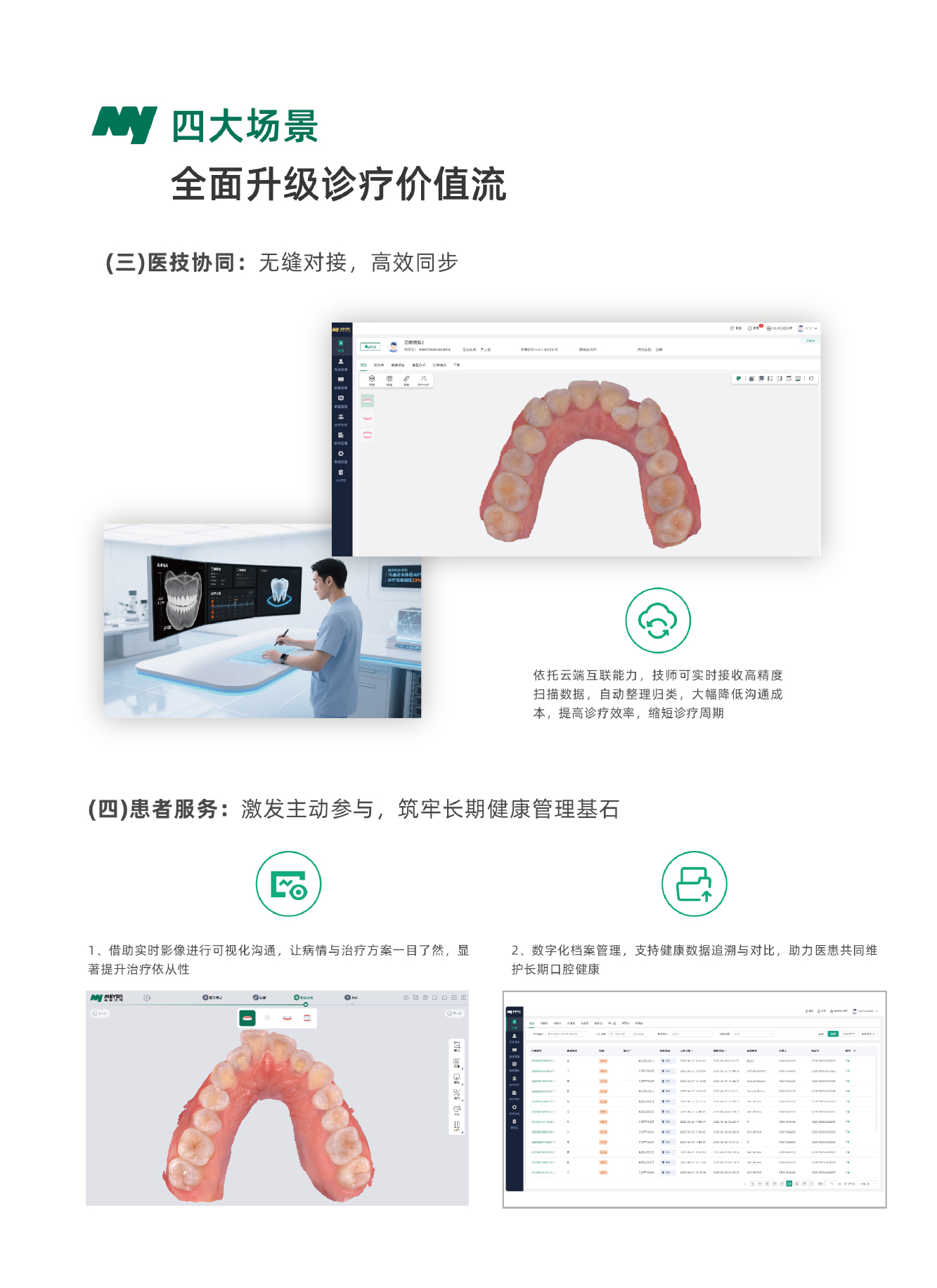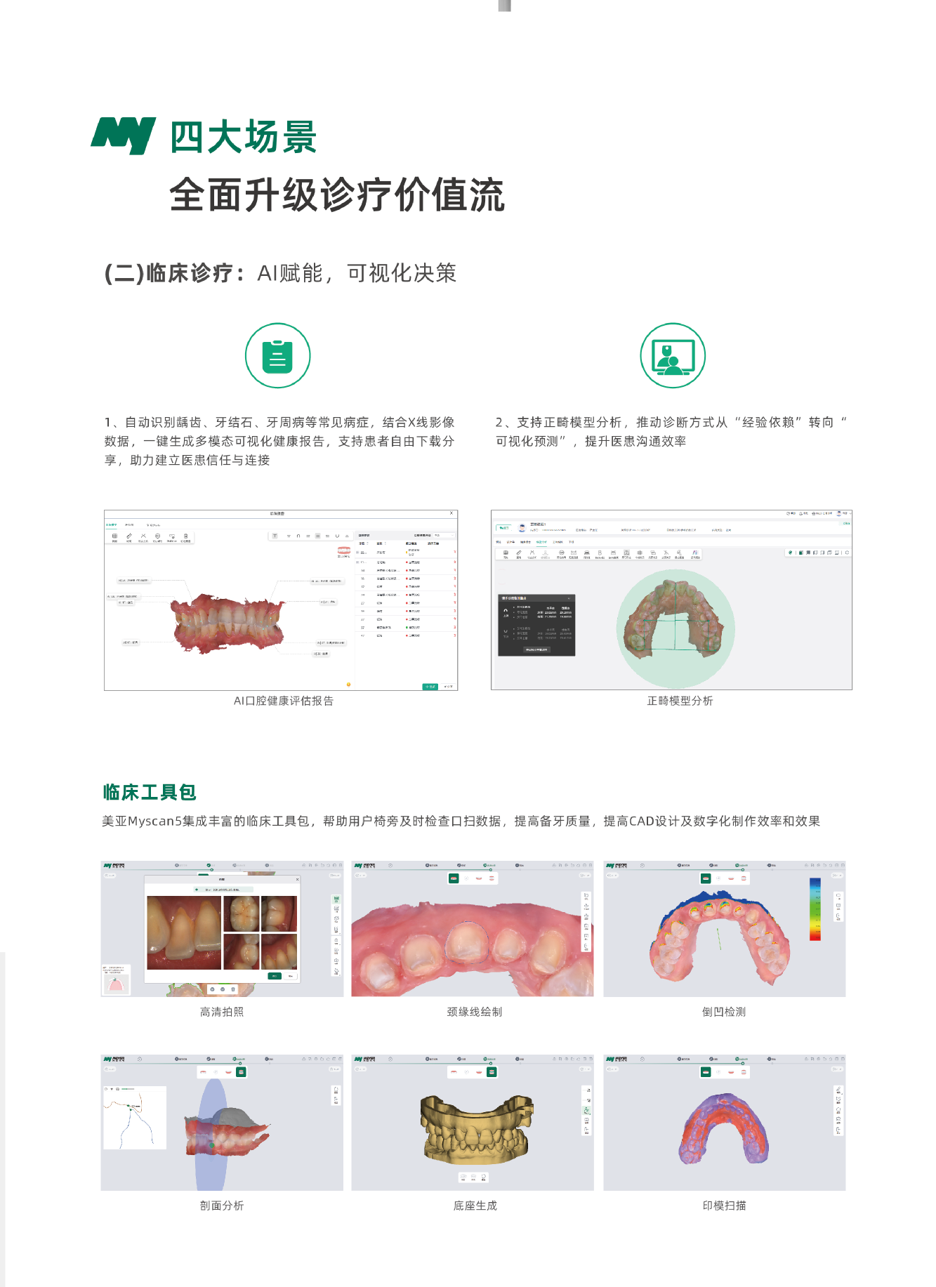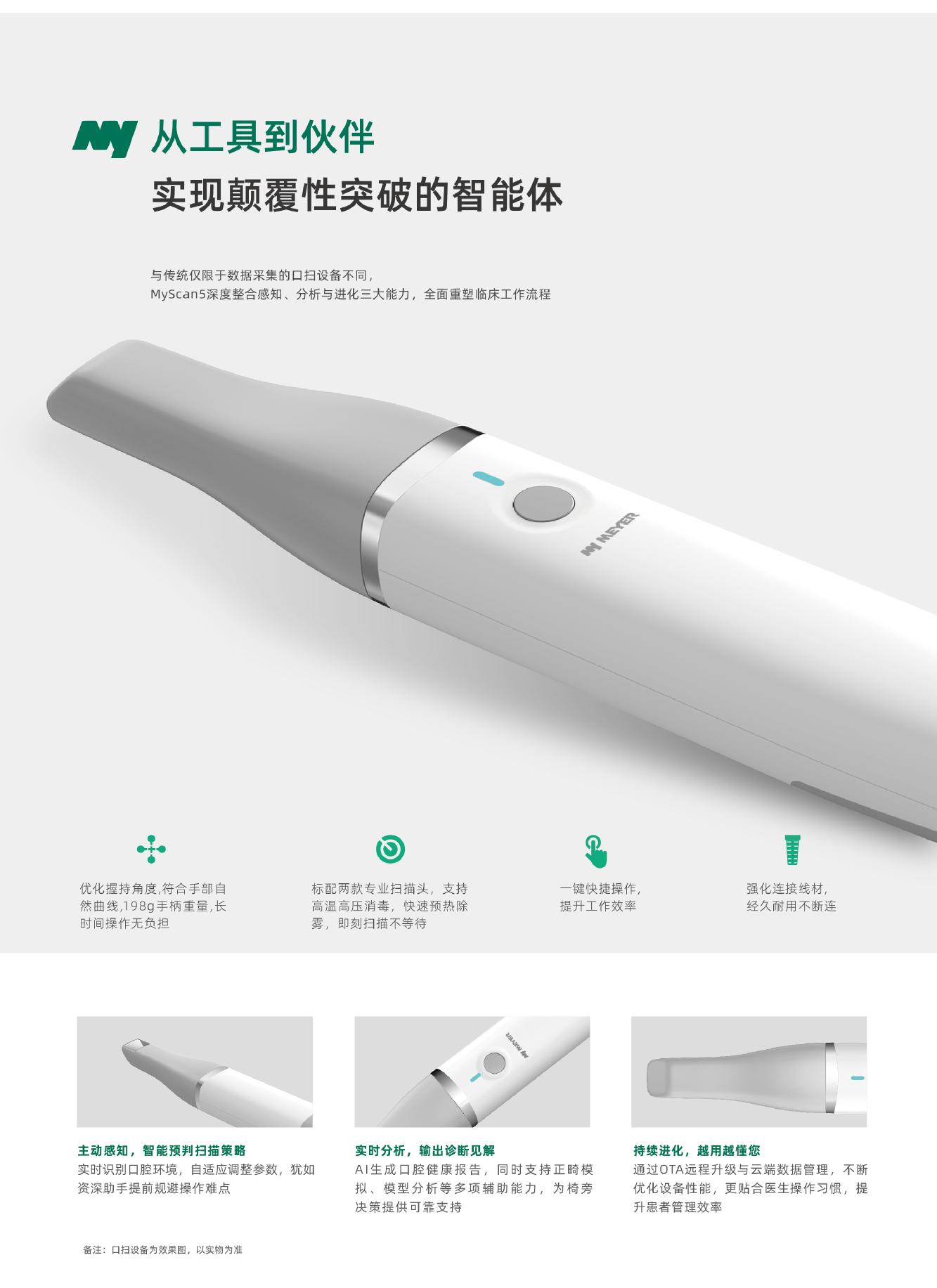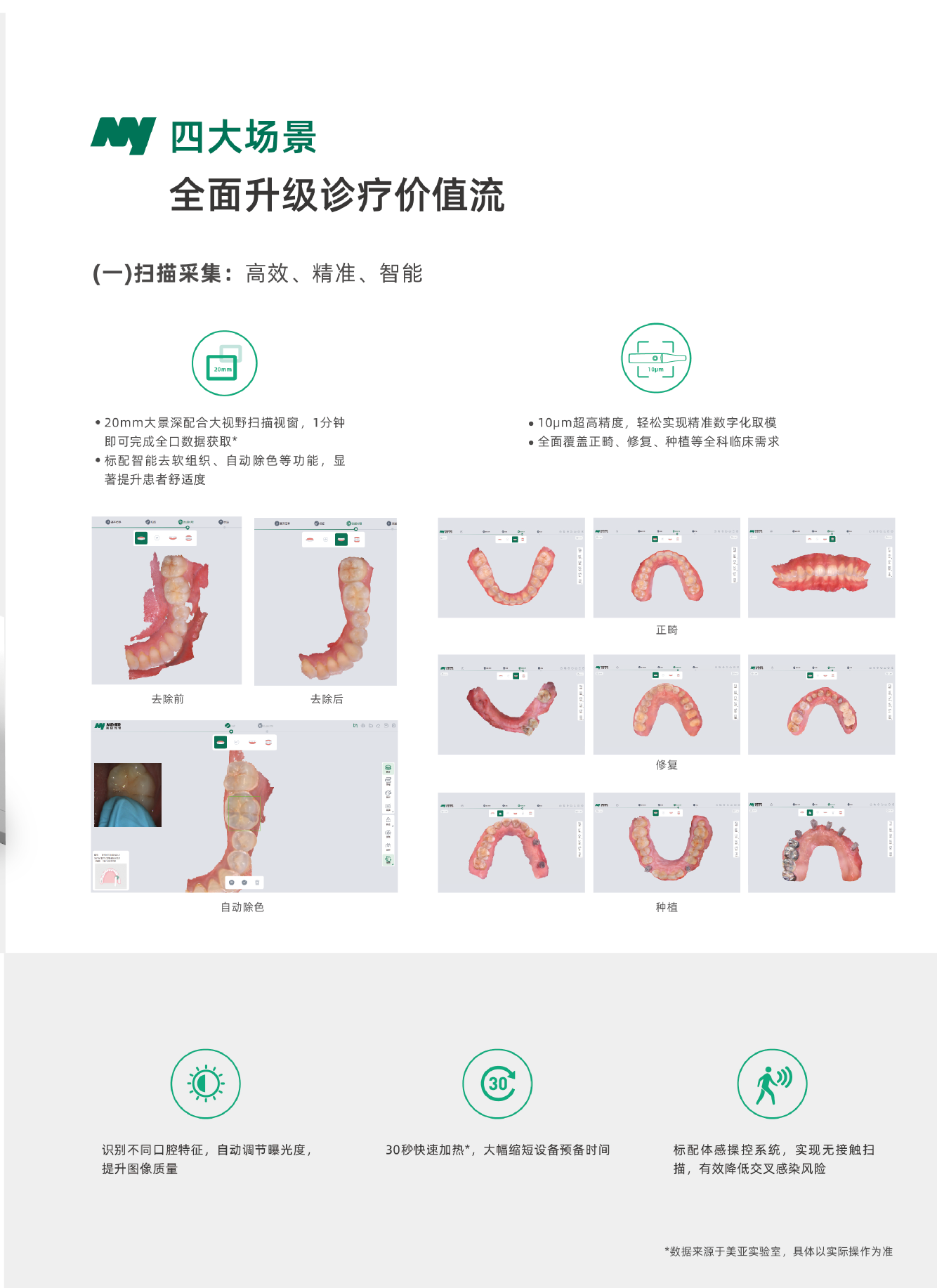 产品通过口内扫描的方式获取牙齿、牙龈、黏膜等软硬组织表面的数字化印模,供口腔修复、正畸用。